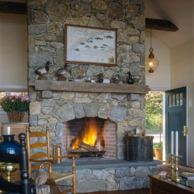 Without changing the footprint , this unmemorable ranch was transformed into a stoned and shingled beauty, making the most of its harborside location.