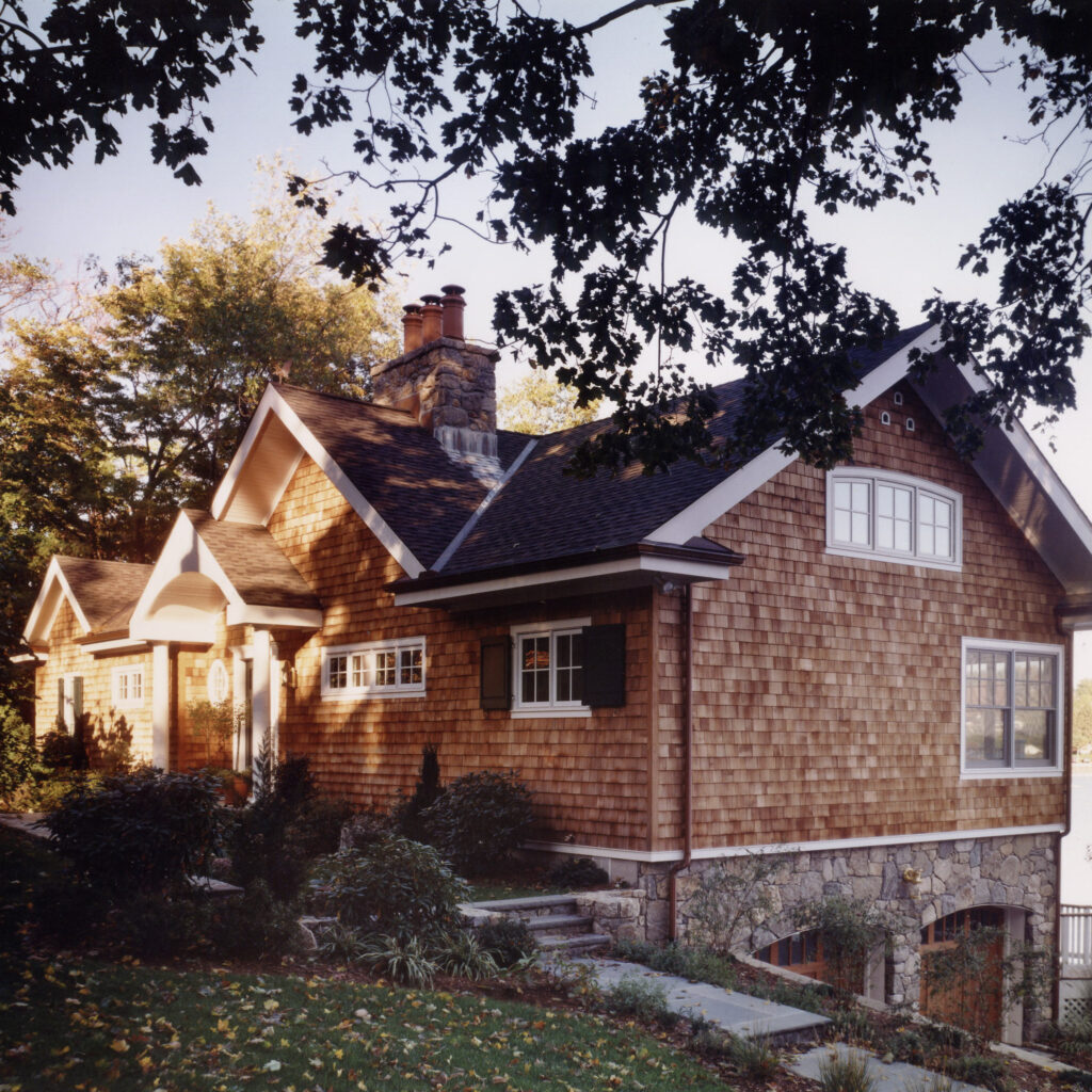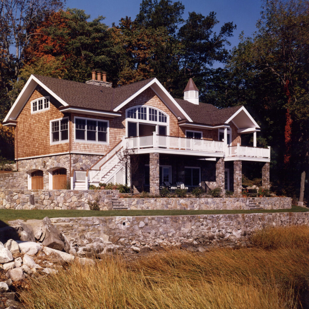 From a non-descript 1950s ranch to shingle style luxe, this renovation not only changed the look and feel of this house, it enabled the owner and his guests to make the most of the spectacular waterfront setting. On the main level, large windows and an open floor plan make all the difference — giving each room, including the primary suite, a water view and access to a spacious deck. On the ground level, the perfect haven for visitors was created with two guestrooms, a bath, pantry and cozy family room leading to a seaside patio.